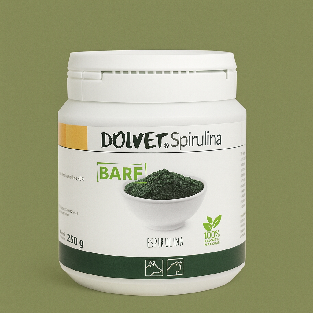 DOLVET SPIRULINA es un complemento nutricional formulado para perros y gatos que aprovecha las propiedades excepcionales de la espirulina, un alga rica en proteínas, vitaminas y minerales esenciales, junto con levadura de cerveza seca que mejora su sabor y valor nutricional. Su fórmula contiene aproximadamente un 97 % de espirulina y un 3 % de levadura, lo que le otorga un perfil nutricional potente y equilibrado.