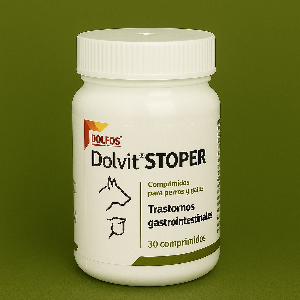 DOLVIT STOPER es un complemento diseñado para estabilizar la función digestiva y proteger el tracto gastrointestinal de perros y gatos. Su fórmula combina esmectita, extracto de taninos de castaño, β‑1,3/1,6‑glucanos, manano-oligosacáridos (MOS), fructooligosacáridos (FOS), yuca de Mojave (Yucca schidigera), levadura de cerveza, pectinas y carbonato de potasio, que actúan en sinergia para inactivar toxinas, favorecer la regeneración de la mucosa intestinal y mejorar la consistencia de las heces.